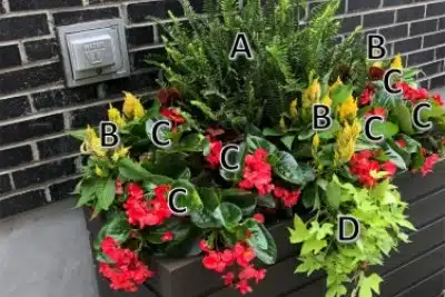 When it comes to ingredient ‘C’, you can use either the green leaf or bronze leaf variety of these large begonias which are a hybrid of an angel wing begonia and a fibrous begonia. Although, if you want to place this in a spot that gets over 6 hours of sun exposure, make sure you use the bronze leaf variety because the bronze leaf begonia typically handles full sunlight better without burning.